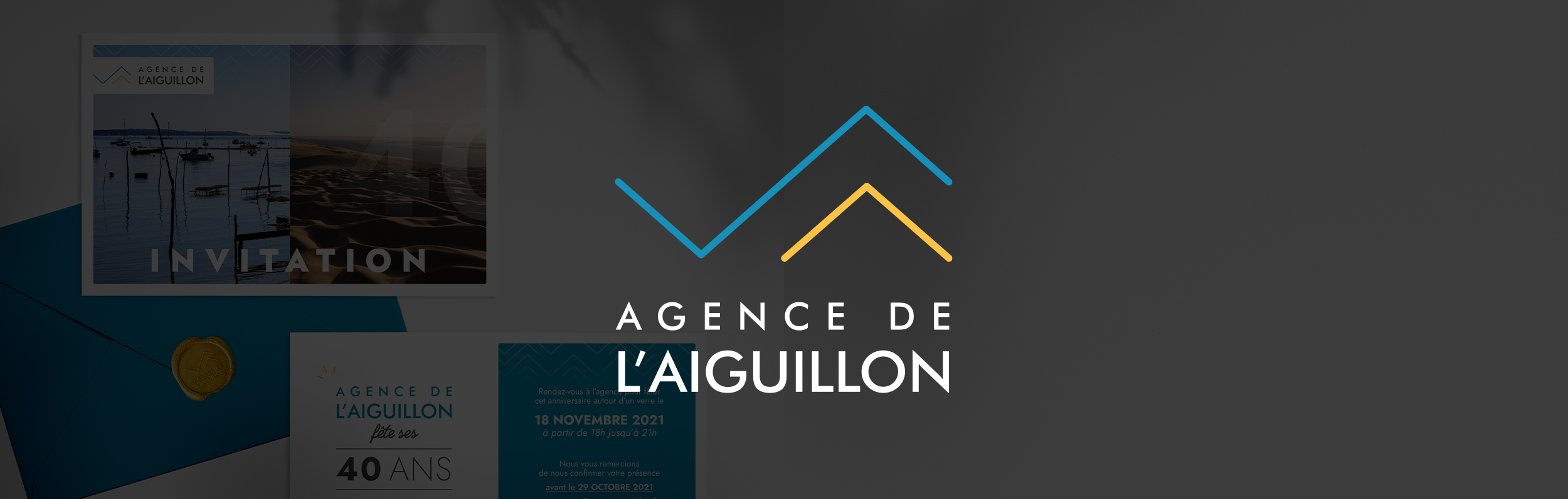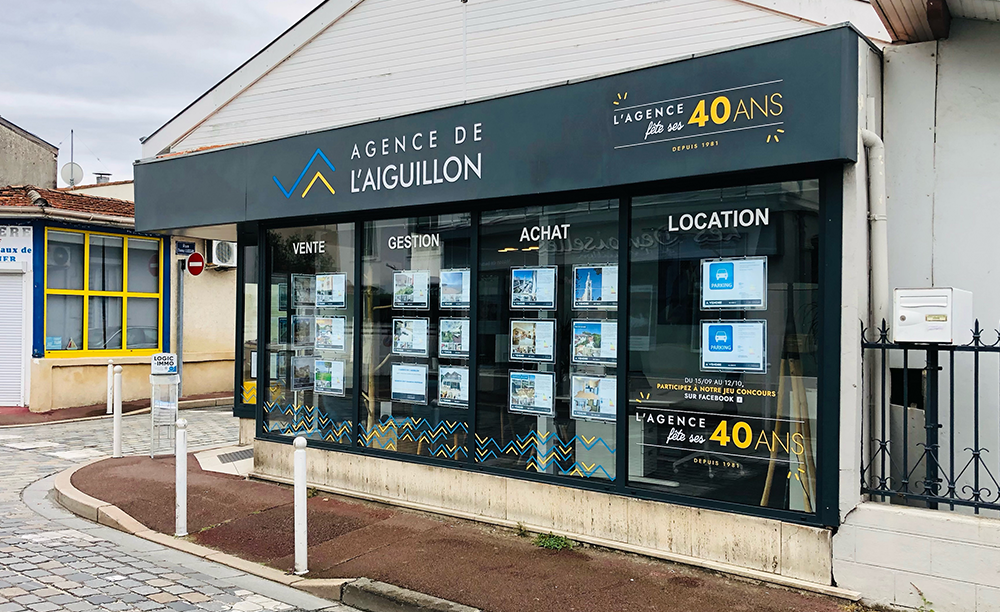 Pour l’occasion de leur 40 ans, l’Agence de l’Aiguillon avait l’envie de dynamiser leur devanture ainsi que leur charte graphique. Dans cette optique, nous avons réalisé un motif reprenant le symbole du logotype afin de l’intégrer aux différents supports de l’agence. Il permet ainsi d’habiller ici, le bas des différentes vitrines. De plus, nous avons réalisé un visuel pour les 40 ans afin d’instaurer une fiabilité face à la future clientèle et d’avertir du jeu concours mis en place pour l’occasion.