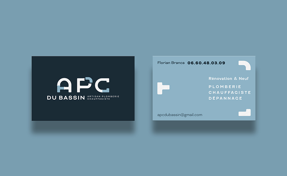 Création d’une identité visuelle pour APC du Bassin, Artisan Plombier Chauffagiste. La typographie du logotype se forme à l’aide d’un système de plomberie : les tuyaux forment les lettres et permettent un première compréhension visuelle de l’activité principale de l’entreprise.