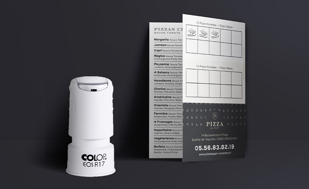 Réalisation et impression de cartes de fidélité à destination des clients réguliers, accompagné d’un tampon personnalisé, réalisé en fonction de la demande. Cette carte comprend également, comme le dépliant, la liste des pizzas et informations de contact, pour perpétuer le lien et ainsi inciter la clientèle à revenir.