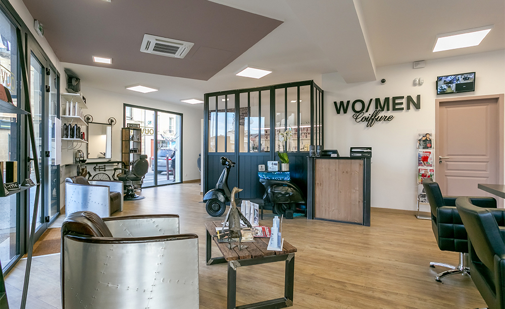 Wo/Men Coiffure est le salon de coiffure premium créé par Un Gars & une Fille. Le logotype devait dégager cette nuance : le choix colorimétrique permet d’instaurer cet aspect haut de gamme.